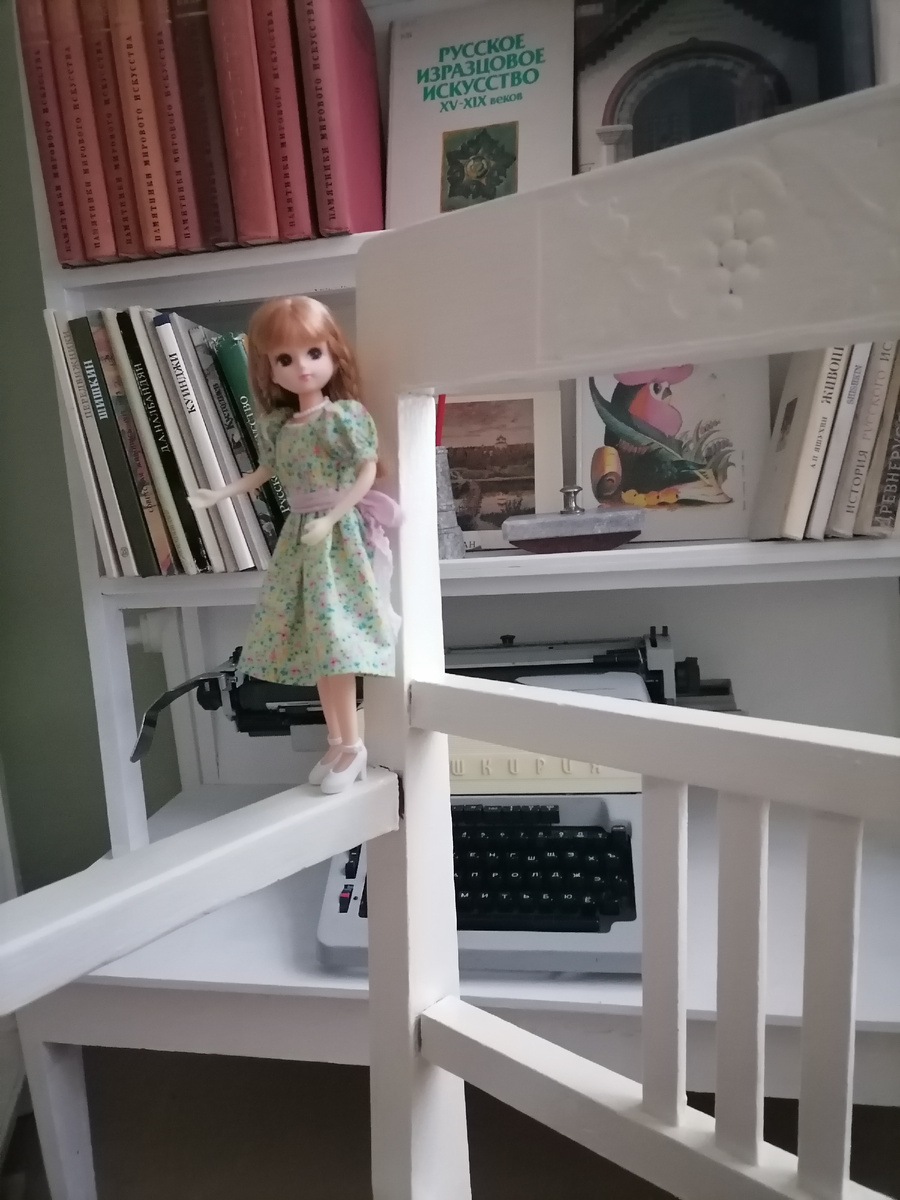 Сижу и иногда думаю, как жалко, что когда дочь просила сшить одежду кукле - я не могла этого сделать, просто ничего не шилось. Теперь дочь подросток, ей не надо, а мне вот захотелось. И с таким удовольствием окунаюсь в это действие... В Вконтакте в группе "Aroundoll" проходит бесплатный шейный марафон по шитью платья для Ликки и я не смогла пройти мимо😁 Перебирая свои небольшие запасики ткани в руки скользнула зелененькая в цветочек. Она мне так нравилась, но никак не могла придумать к кому применить. А тут раз и сразу поняла, что хочу сшить платье для куколки именно из этой ткани. Все швы ручные😁 Край на подоле на паутинке (как же мне понравился этот способ) Пару вечеров после работы и платье готово. Ах, какая красота получилась😍 В общем, понесла я своих куколок на работу, всем показала и сделала несколько фото. К сожалению, это фото не очень чёткое, не сразу заметила. Есть у нас в библиотеке так называемый ретро-уголок😉 там старая мебель, примерно с 50х годов ХХ века. Мебель
