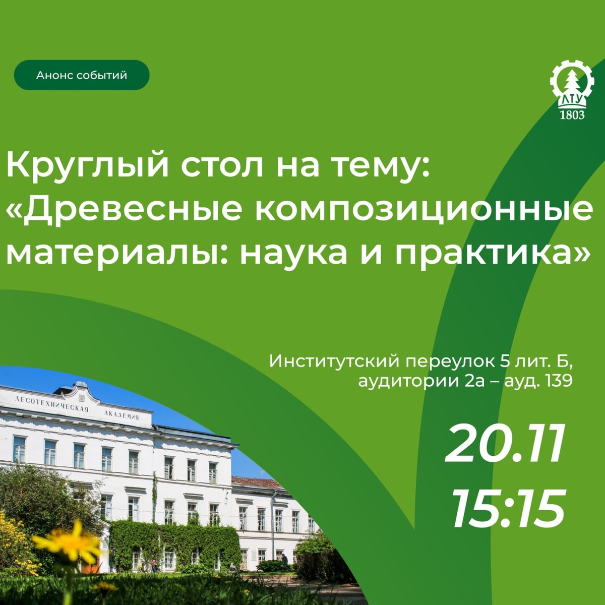 Круглый стол «Древесные композиционные материалы: наука и практика» ☝ 20 ноября 2025 г. на кафедре Технологии химической переработки биомассы дерева СПбГЛТУ им. С.М. Кирова состоится круглый стол на тему: «Древесные композиционные материалы: наука и практика». 📍 Мероприятие пройдёт по адресу: 194021, СПб, Институтский переулок 5 лит. Б, в аудитории 2а, ауд. 139. ⏰ Время начала – 15:15. Во время работы круглого стола будут затронуты следующие вопросы: – роль науки в становлении производства древесных пластиков и плит; – причины противоречий между наукой и практикой на современном этапе развития отрасли; – современное состояние науки в отрасли; роль науки в ВУЗах и студенческих научных обществ. Приглашаем всех желающих принять участие в мероприятии. Вход свободный. Организаторы мероприятия: студенческое научное общество «Технологии древесных плит и пластиков» СПбГЛТУ им. С.М. Кирова и Ассоциация «Лестех». 👉 Читайте подробную информацию здесь 👈 👻 МАХ | 📲 ВК | 📝 ДЗЕН