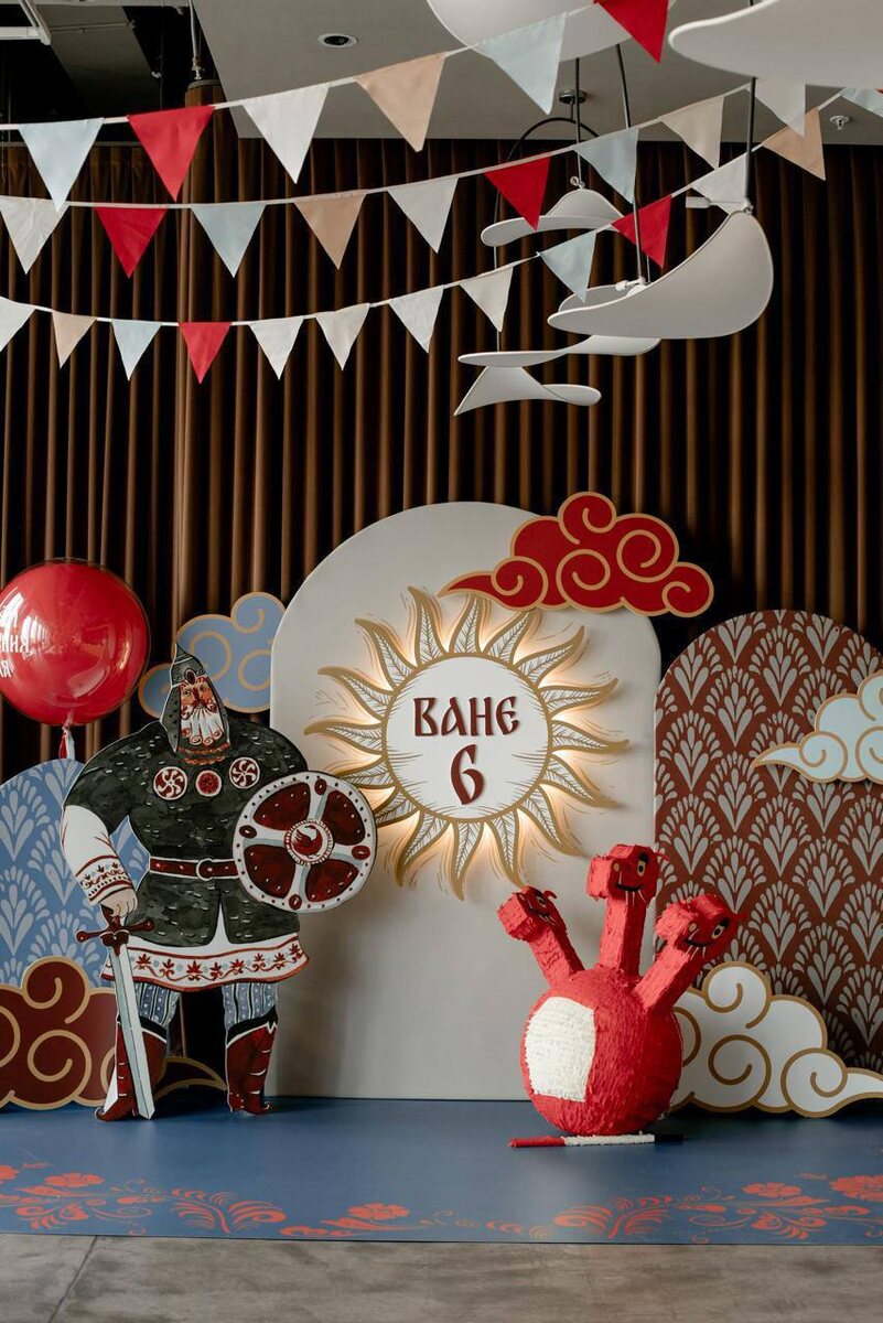 Русская сказка на вашем столе🏹 Когда декор праздника не просто украшает, а погружает в мир любимых героев и былинных приключений! На дне рождения нашего именинника, которому исполнилось 6 лет, мы создали настоящую богатырскую заставу, полную силы, отваги и русского духа✨ В центре внимания, конечно же, были три богатыря! Их силуэты, изображения коней и характерные для былин мотивы украшали помещение. А куда же без главного врага богатырей — Змея Горыныча? Его устрашающий, но по-сказочному выполненный образ добавил празднику динамики ⚡️ Удалось ли нам перенестись в мир былин и подвигов? Мы уверены, что да🎂 О деталях организации самого праздника скоро расскажем ❤️ #sm_party_праздники