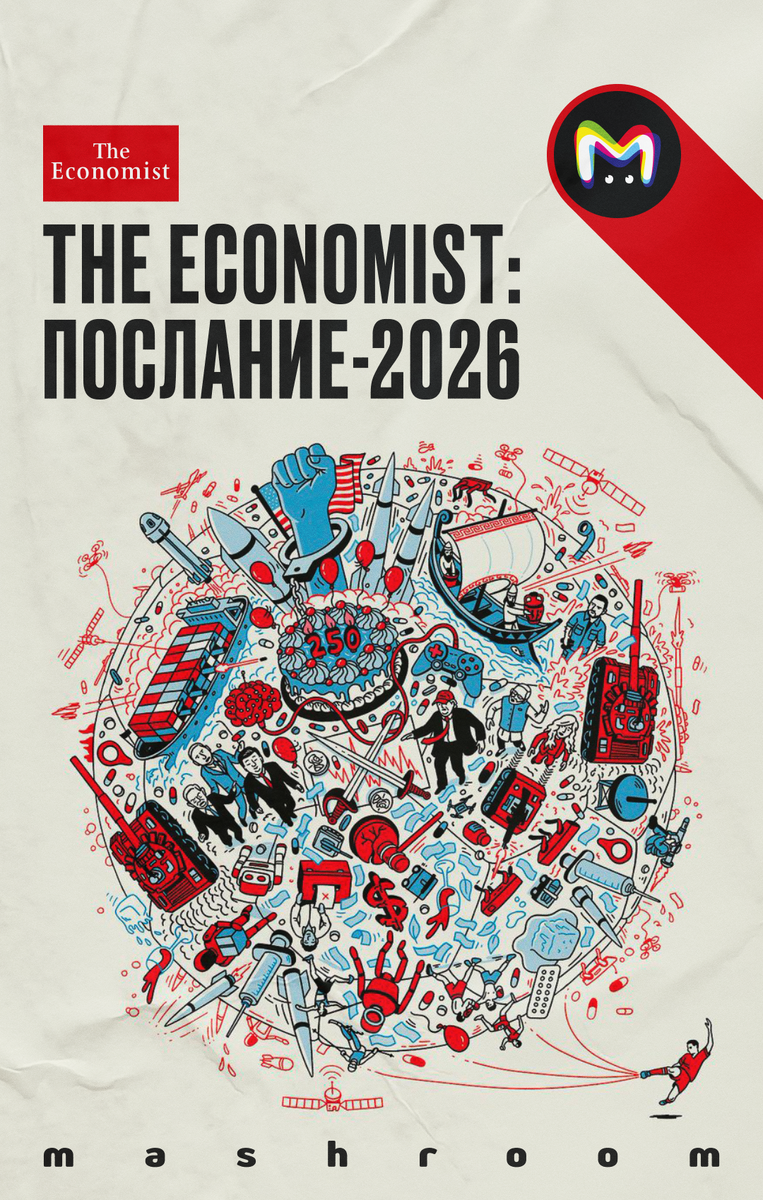 Конспирологи на месте? Принесли вам новую обложку The Economist с прогнозами на 2026 год. Ежегодно журнал вбрасывает на суд общественности картинку-ребус. Типа мы, конечно, ничего не утверждаем, но… Насколько правдивыми оказались предсказания на 2024-й и 2025-й — рассудите сами. А мы собрали самые важные расшифровки новой мозаики и добавили немного аналитики от себя. Что готовит год грядущий — разложили на новых карточках. Пишите, что ещё высмотрели, обсудим! Ребус запрятан в общей картине в форме круга. Круг — это, конечно, наша планета. Но в 2026-м мир и покой ей может только сниться. Ребус раскрашен в сине-красные тона. Они не смешиваются, ничего промежуточного нет. Это метафора двух сил, двух полюсов, которые борются за право определять будущее. Красный — вспышка, цвет крови, цвет войны. Синий — цвет холодного расчёта, чёткой логики и торжества технологий. Новая архитектура будет выстраиваться на арене, где глобальные силы не столько пытаются вытолкнуть друг друга за контуры мира,