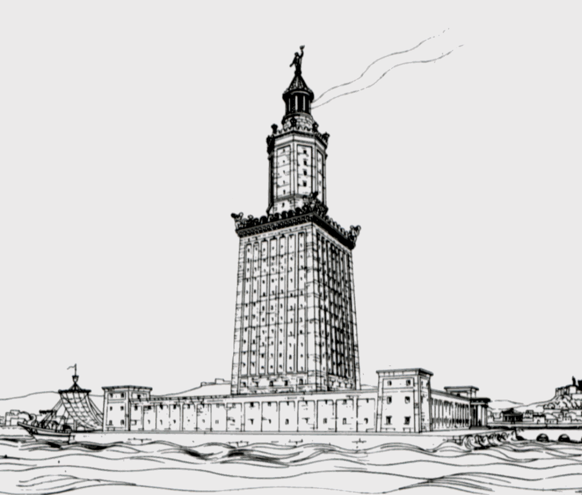 Александрийский маяк, также известный как Фаросский маяк, был построен в III веке до н. э. на острове Фарос у берегов Александрии, столицы эллинистического Египта. Согласно источникам, его высота составляла около 120-150 метров. Для сравнения, это высота современного 40-этажного здания. На протяжении многих веков он оставался одним из самых высоких рукотворных сооружений в мире, также вошел в тройку наиболее долго продержавшихся чудес света (также сюда относят пирамиду Хеопса и разрушенный землетрясением в конце XV века Галикарнасский мавзолей). По описаниям арабских авторов, конструкция маяка состояла из трех ярусов: первый ярус квадратного сечения примерно 30 на 30 метров высотой в 4 этажа, второй – восьмигранная башня диаметром около 16 метров и третий ярус, круглая башня с винтообразной лестницей внутри, где находилась система зеркал, а по ночам горел огонь. На вершине находилась статуя одного из богов, предположительно Посейдона или Зевса. Маяк выполнял важную задачу: он указывал
