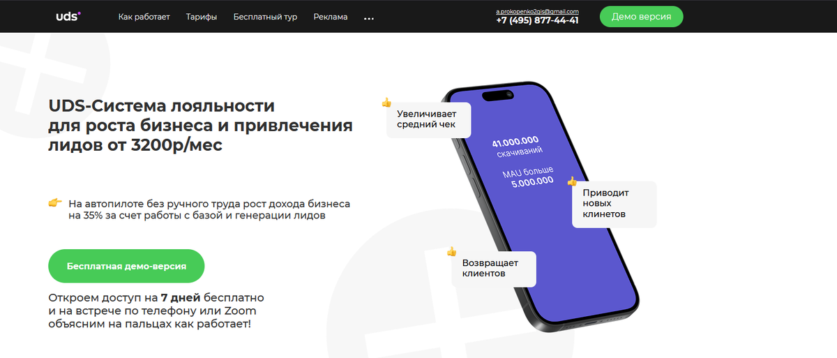 UDS Описание компании: UDS — омниканальная программа лояльности и маркетинга для бизнеса. Чем занимается: подключает бизнес-компании к облачной платформе для создания бонусных карт, рефералов, кросс-маркетинга, Telegram-бота, аналитики и онлайн-заказов. Какие услуги оказывает: разработка и внедрение системы лояльности «под ключ», интеграция с кассами, управление клиентской базой, сегментация RFM, push-рассылки, интернет-магазин, Telegram-бот, отчёты и аналитика. Какие преимущества выделены на сайте: рост выручки до +30 %, подключение за 3 дня, безлимитная база клиентов, новые клиенты из платформы, готовый Telegram-бот без установки приложения. grandbazar RetailCRM Teyca Mindbox EasyWeek Manzana Group Loymax Loyalty REES46 Boostfeel GetMeBack RX-Loyalty БезКарт GoPoints Loyal Club Referof MAXMA Prime Hill РусБонус ЭвоБонус YCLIENTS Mace Loyalty Passteam LoyalClient Mybill Bonus Bot