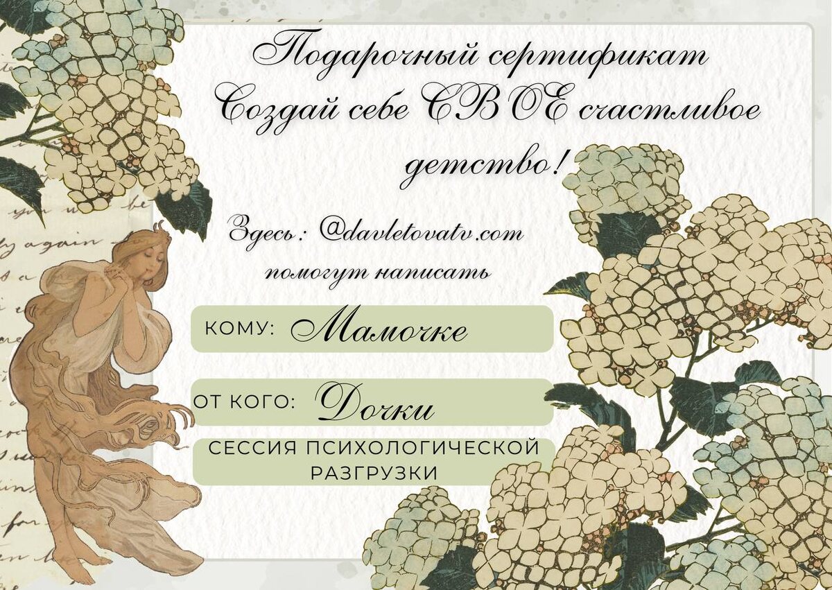 Мои дорогие, я не продаю «пакеты» впрок, курсы, программы 🫣 🙏🏼Но благодарю вас за подсказку, подарочный сертификат (внимание, на одну сессию), я осилила. И то, только по тому, что воплощаю ваши идеи по дизайну и стилю. Для тех, кто отмечает День Матери, получился вот такой шедевр. Это жест поддержки, который говорит: «Я в тебя верю» В чем удобство⤵️ ✅ Оплата только после решения получателя — вы дарите возможность, а не обязательство ✅ Полная свобода выбора — индивидуально или парой, онлайн или в кабинете, на русском или английском ✅ Индивидуальный дизайн — создаем персональный сертификат, отражающий ваши отношения Дарим не вещь, а шанс изменить жизнь. Подробности: https://davletovatv.com/blog-tatiana-davletova/tpost/iedfxk0ko1-podarochnii-sertifikat-perezagruzka #подарочныйсертификат_davletovatv #создавайанепокупай #отцыидети