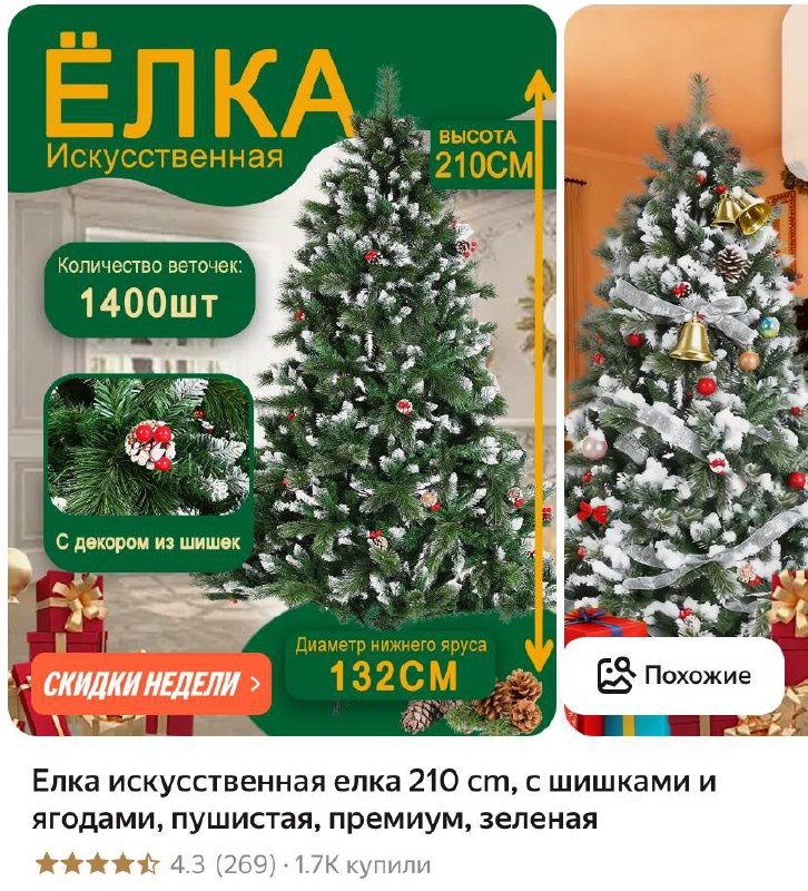 Елка искусственная елка 210 cm, с шишками и ягодами, пушистая, премиум, зеленая