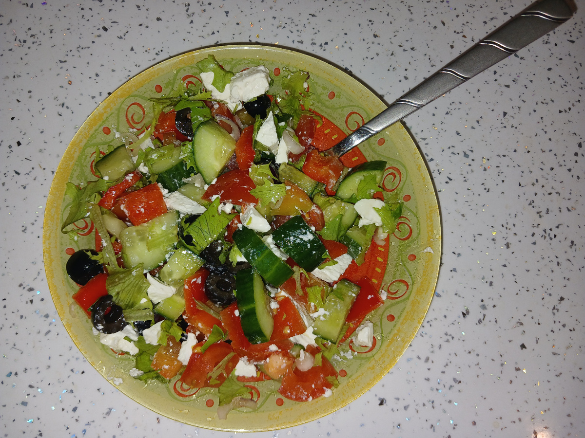 Салат греческий. Остался с выходных, был на завтрак и обед. Грубо прикинула, что 250г как раз 250ккал.