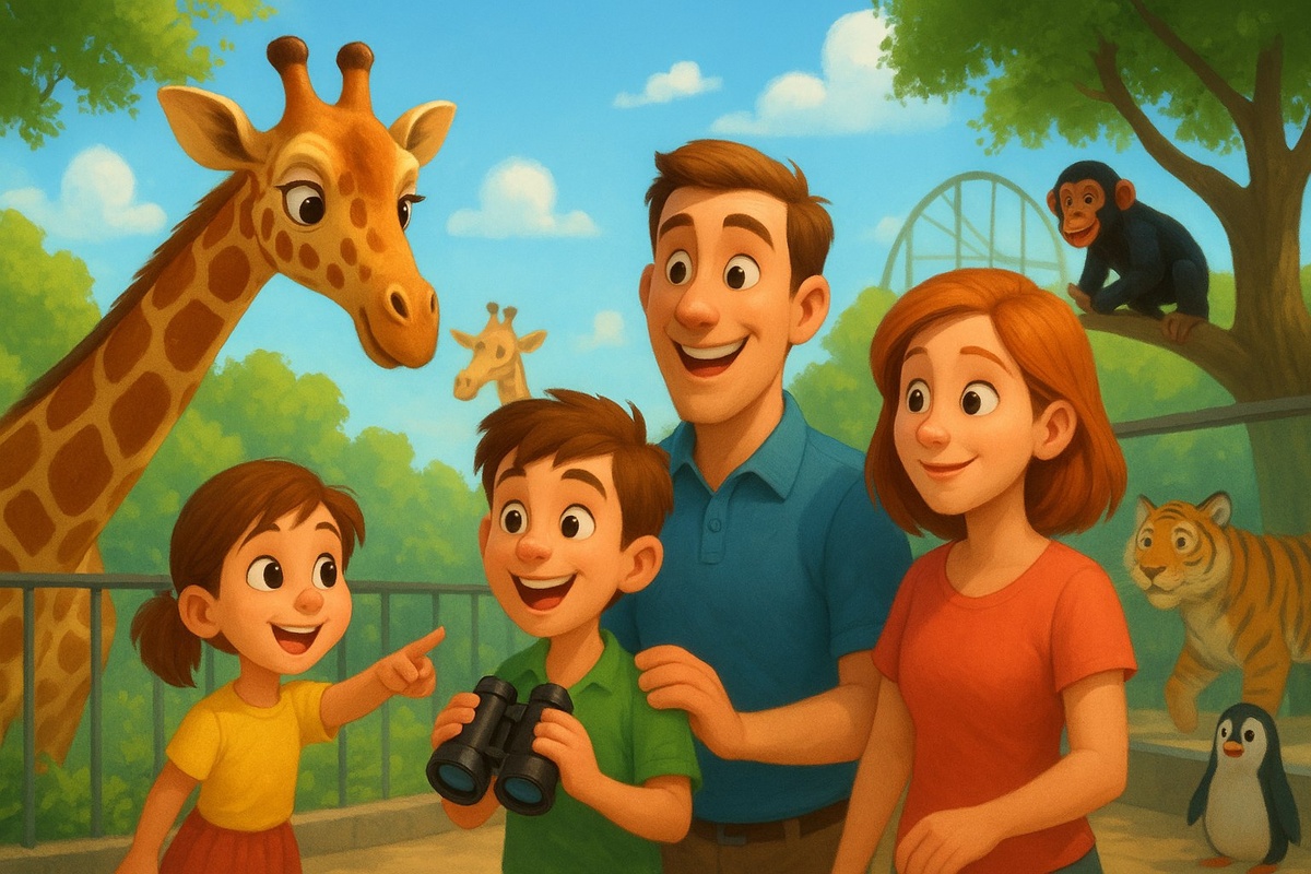 Сказка «Большое приключение в зоопарке» В один солнечный выходной день мама, папа и их двое детей — любознательный Артём и весёлая Мила — проснулись раньше обычного. Не потому что куда-то спешили, а потому что сегодня был особенный день. День, которого все ждали уже несколько недель. — Угадайте, куда мы отправляемся? — загадочно спросила мама. Дети переглянулись. Глаза Артёма загорелись, а Мила подпрыгнула от радости. — В зоопааарк!!! — закричали они хором. У входа в зоопарк семью встретил лёгкий запах свежей травы и далёкие голоса животных. Всё вокруг казалось настоящим царством приключений. Папа дал каждому по маленькому биноклю: — Чтобы видеть даже самых скрытных зверят! Первым они подошли к вольеру жирафов. Длинношеие великаны спокойно пережёвывали листья, медленно поворачивая головы. Мила восхищённо прошептала: — Они как живые башни! Один жираф нагнулся так близко, что казалось — вот-вот дотронется своей мягкой мордой до девочки. Потом семья отправилась к обезьянам. Там было н