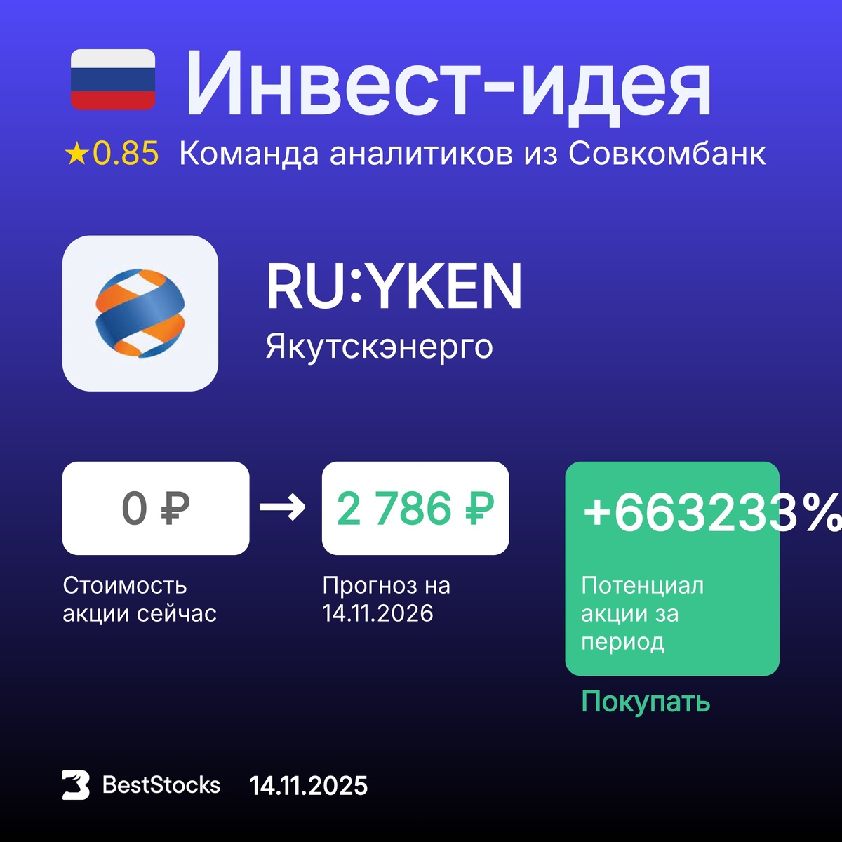 🇷🇺 Инвест-идеи по русским акциям Прогноз по акции Якутскэнерго Прогнозная цена: 2786 ₽ (+663233%) Рекомендация: Покупать Дата прогноза: 14.11.2025 Прогноз до: 14.11.2026 Инвест-компания: Совкомбанк Автор прогноза: Команда аналитиков Ещё рекомендации на сегодня → ••••• ❓ Брокер перестал показывать стоимость портфеля? Это можно исправить — BestStocks сделал специальный бесплатный инструмент, который показывает стоимость всех акций в вашем портфеле в реальном времени. Попробовать бесплатно