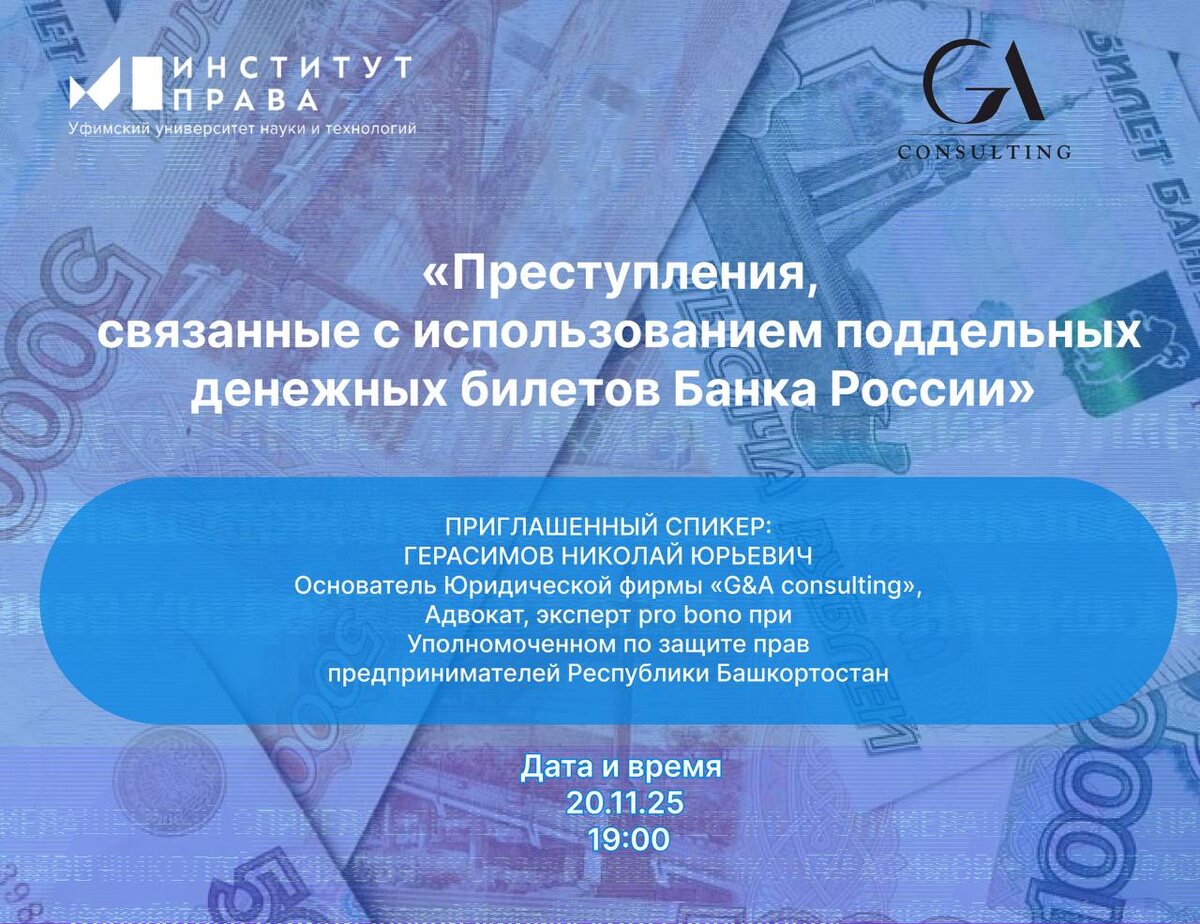 🔹🔹🔹🔹🔹 А вы знаете, как юридически грамотно действовать, если вам попалась фальшивая купюра? Вам известны признаки, по которым можно отличить оригинальную купюру от поддельной? Эти вопросы актуальны не только для криминалистов - каждый юрист должен понимать правовую квалификацию таких дел и уметь защитить интересы Доверителя! 🙌🏻 Мастер-класс: «Преступления, связанные с использованием поддельных денежных билетов Банка России» Спикеры: 🔹 Герасимов Николай Юрьевич, управляющий партнер юридической фирмы «G&A сonsulting», эксперт pro bono при уполномоченном по правам предпринимателя в РБ: «Преступления, связанные с использованием поддельных денежных билетов Банка России» - Уголовно-правовая квалификация по ст. 186 УК РФ - Мошенничество, совершенное с использованием поддельных денежных билетов Банка России - Особенности доказывания и защиты - Актуальная судебная практика 🔹 Балдин Федор Юрьевич, эксперт Экспертно-криминалистического центра МВД по Республике Башкортостан: «Денежные