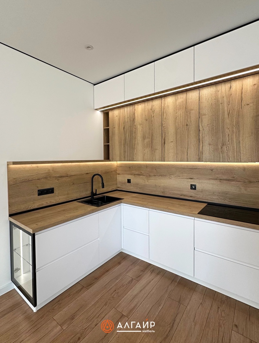 Лаконичный дизайн, система push-to-open и продуманная система хранения. Мы создали этот проект из высококачественных материалов с безупречной точностью сборки. Корпус выполнен из ЛДСП с текстурой натурального дерева, а белые матовые фасады из МДФ в сочетании с мягкой подсветкой создают ощущение утончённой роскоши 🤌🏾 Эта кухня — не просто место для готовки, а пространство, в котором приятно жить и проводить время ❤️ 💌 Подберите оптимальное решение под ваш бюджет по ссылке у нашего менеджера.