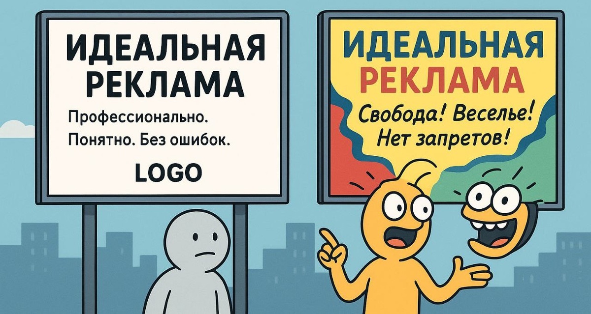 Представьте город, где каждый баннер — идеален: Шрифты ровные, цвета подобраны, слоганы грамотные… и никто на них не смотрит. Да, именно так: Идеальная реклама — это как салат без соли. Вкусно, но скучно. Баннер мечты (для роботов)