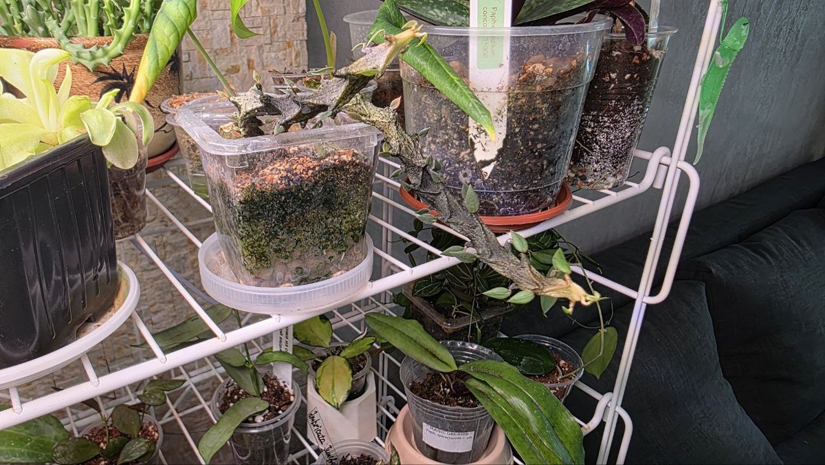 Свето-цветоприключения драконьей церопегии. Да, прям явно все дело в освещении - нарисовала схему с полосками даже) Нижние части зеленые - искусственное освещение бытовыми лампами Следующая черная часть - поджарка на прямом солнце летом Следующая светлая - опять бытовые лампы. Белый хвостик, который уже зеленоватый цвет приобрел - коробка, страх, темнота, переезд. Иногда мне кажется, что у меня после коробок и переезда тоже хвостики белые) Да, знаю, новые хвостики всегда светлые, но из коробки были прям белые. Поставила чернеть и жариться под крутую лампу, посмотрим.