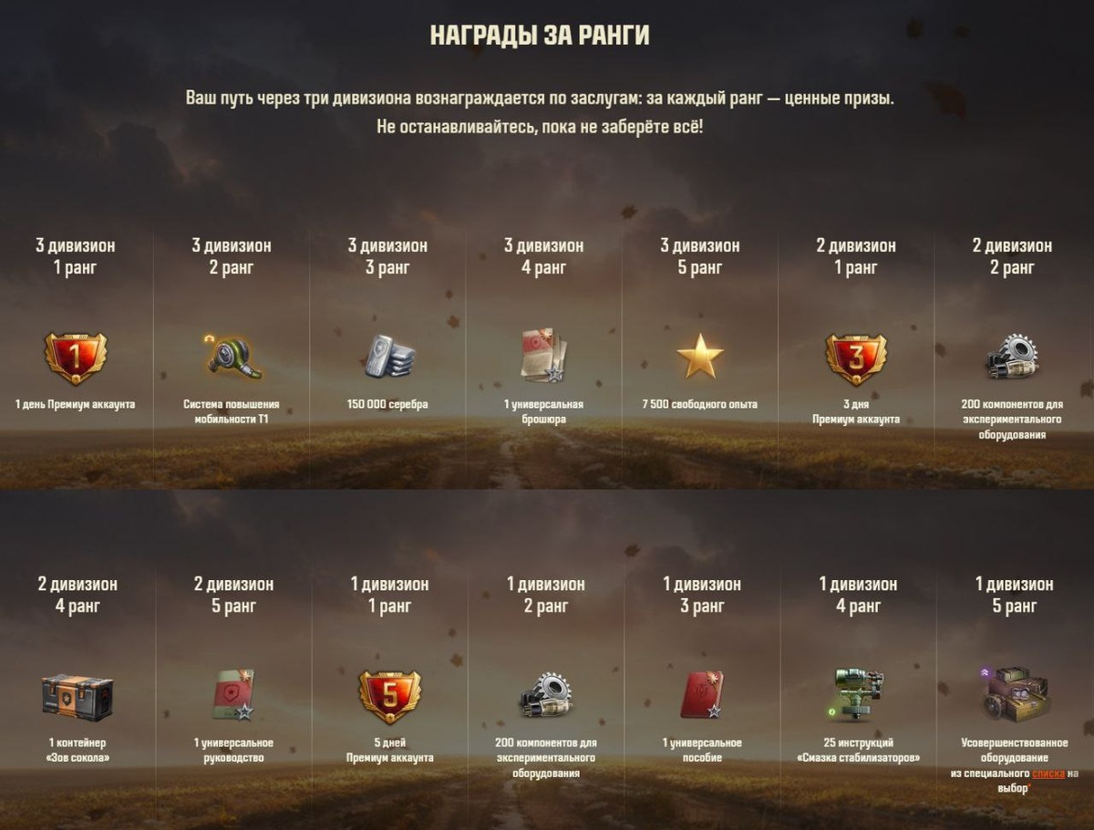 🗼🌵 Ранговые бои на VI уровне стартовали! 🗓 17 ноября 7:00 (МСК) — 1 декабря 2:00 (МСК) 1️⃣ RU1: 13:00 (МСК) — 2:00 (МСК) 8️⃣ RU8: 7:00 (МСК) — 16:00 (МСК) 🔥 В этом запуске — новые награды, больше очков Боевого пропуска и особое состязание с золотым призовым фондом! ➡️ Подробности и награды события здесь 🗞 Что необходимо знать: 🪮 Участвует только техника VI уровня. Стандартный бой продолжительностью 10 минут. Формат: 10×10. 🪮 Три дивизиона по пять рангов – ваш путь к ценным наградам. Некоторые ранги несгораемые: они сохраняются после поражений. 🪮 Опыт начисляется по правилам Случайного боя - за урон, уничтожение техники и содействие союзникам. За правильный отыгрыш роли машины можно получить еще больше опыта. 🪮 Выполняйте боевые задачи, чтобы получить Призовые бои. За победу в них - вдвое больше шевронов. 🪮 За участие в боях начисляются очки Боевого пропуска - в этом запуске их станет больше. Также их можно получить за выполнение боевых задач. 🪮 Сражения проходят на 12 кар