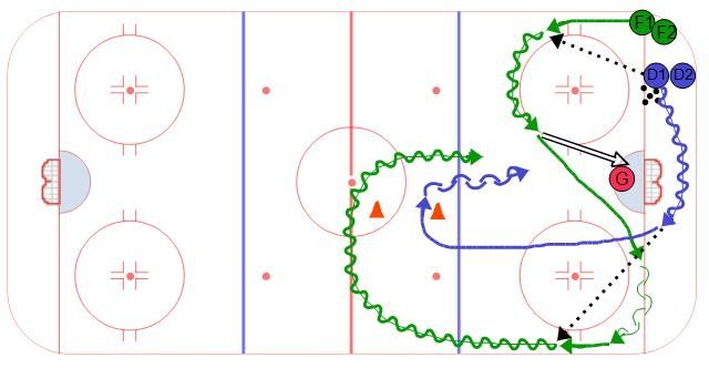 - «Таран» (или «Снаряд» / «Dump and Chase»): Классическая схема, основанная на силовой борьбе. Атакующие игроки не ведут шайбу через синюю линию, а забрасывают ее вглубь чужой зоны и устремляются в борьбу за нее. Цель — отобрать шайбу за счет физического превосходства и создать давление у бортов. Эффективна против техничных, но не самых физически мощных команд.