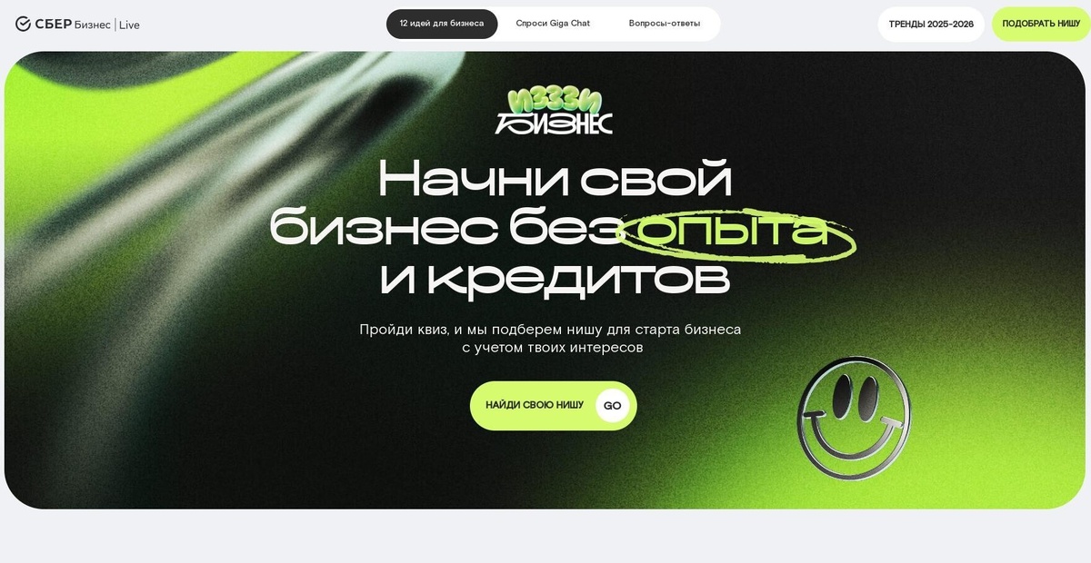 Выбери бизнес по вайбу: «Сбер» представил навигатор для начинающих молодых предпринимателей По данным ФНС и Минэкономразвития, интерес молодежи к предпринимательству продолжает расти: к середине 2024 г. в России насчитывалось около 2,7 млн ИП и самозанятых младше 25 лет — это рекордный показатель. Даже среди подростков фиксируется рост: к началу 2025 г. число ИП в возрасте до 18 лет превысило 13 тыс. чел. При этом многие начинающие бизнесмены сталкиваются с проблемой выбора направления. «Сбер» разработал специальный лендинг для определения своей ниши в бизнесе. https://clck.ru/3QMocA В интерактивном квизе надо ответить на 6 вопросов. На основе ответов алгоритм подбирает одну из 12 бизнес-ниш: от блогинга и креативных услуг, которые почти не требуют вложений, до ИИ-проектов с бюджетом от 100 тыс. руб.