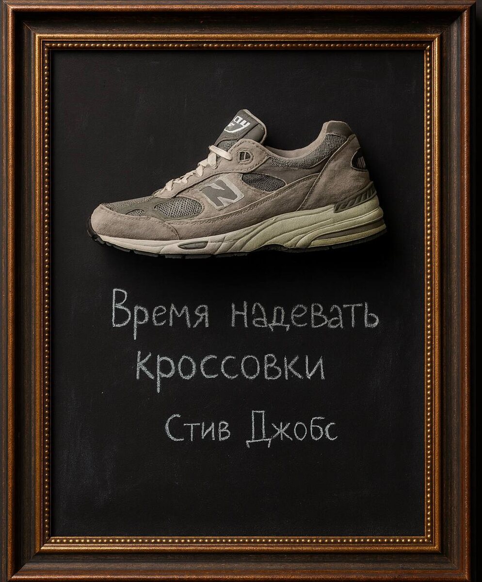 «Время надевать кроссовки» Высказывание принадлежит не модному фэшн блогеру. Сказал это тот, кто «пришел в этот мир пробить брешь мироздания». Что это значит? это мотивирующая фраза предназначена для предпринимателей, которые переживают нелегкие времена в бизнесе. Ты ходишь прогулочным шагом и ноешь, что нет прибыли? Так самое время обогнать конкурентов. Но для начала надень Нью беленс 991 Впервые я услышала это выражение от своего начальника-партнера. Он тогда прочитал биографию Стива Джобса и был вдохновлен не только его кроссовками, но и его парадоксальным мышлением, скилами маркетолога и визионерством. Я помню после этой книги у нас в офисе появилась картина: в багете черный квадрат, к которому были «приклеены или прибиты» 42 размера Нью беленс 991. И всю эту композицию дополняла сентенция «время надевать кроссовки». Компания тогда проходила трудные времена, нужно было поднимать боевой дух сотрудников, мотивировать на выполнение кипиай, хотя бы изредка выполнять план, вый