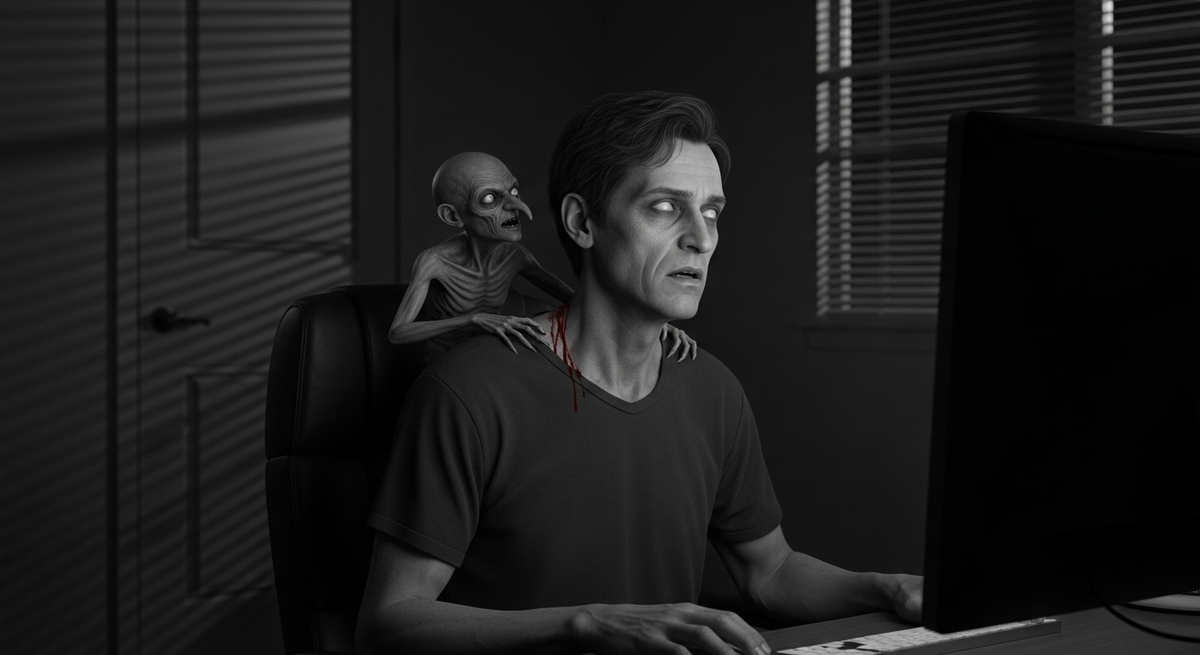 Я начал видеозвонок, ожидая, как обычно, что Джеймс зайдёт с выключенной камерой. Но его лицо заполнило мой экран. Он выглядел истощённым. Глаза были полностью белые. Но ещё страннее — на его плечах сидел крошечный, уродливый человечек с крючковатым носом и бусинами чёрных глаз и дёргал его за волосы.