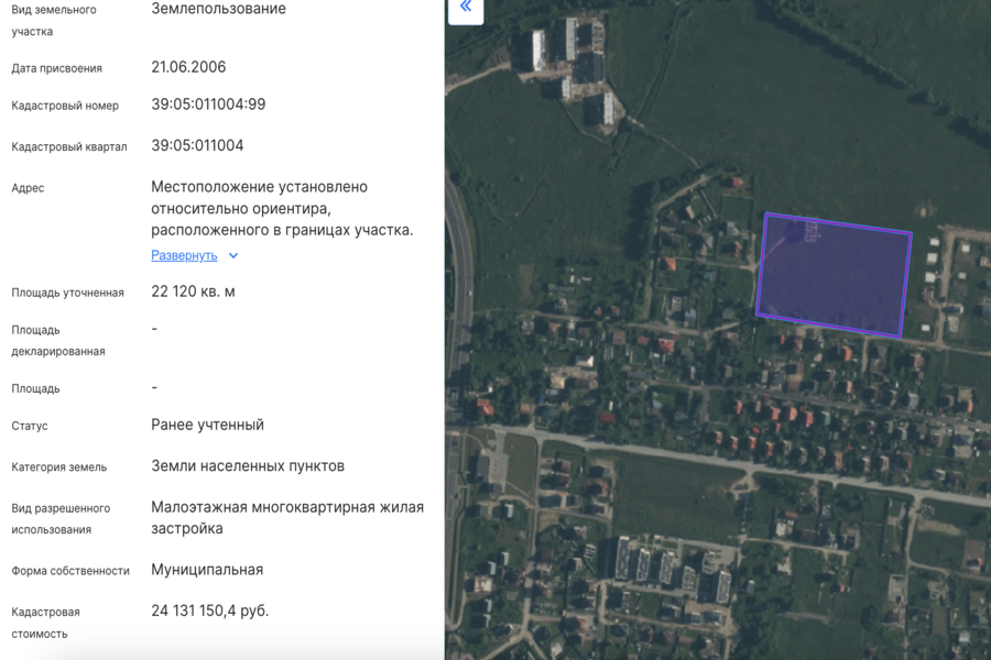 Областные власти выдали разрешение на первый этап строительства малоэтажных многоквартирных домов в п. Сосновка Зеленоградского округа. Как сообщило министерство градостроительной политики Калининградской области в ответ на информационный запрос «Нового Калининграда», дома будут четырёхэтажными, а их общая площадь составит 3167,7 кв. м. Строительство запланировано на участке с кадастровым номером 39:05:011004:99, предназначенном под малоэтажную жилую застройку. Уточнённая площадь участка составляет 22 120 кв. м, а стоимость по кадастру — 24,1 млн руб. Разрешение будет действительно до 31 октября 2028 года. Изображение: скриншот публичной кадастровой карты Строительством займется ООО «Новая компания», которое зарегистрировано в Калининграде в Ржевском переулке. Основной вид деятельности фирмы — аренда и управление собственным или арендованным недвижимым имуществом. Генеральным директором и учредителем выступает Олег Фильчак. Кроме того, власти уточнили параметры других объектов, на кото