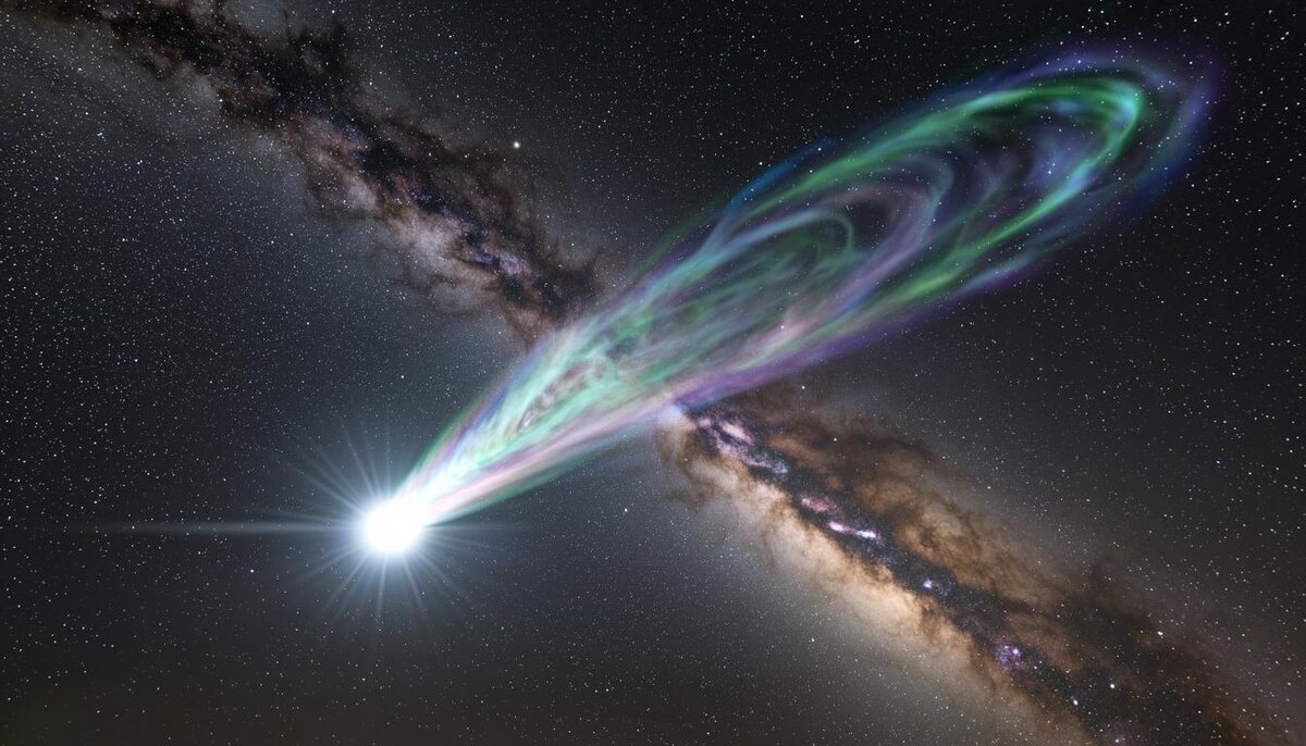 - Пылевой хвост: Состоит из мелких частиц пыли, сдутых с ядра давлением солнечного света. Он обычно более широкий, изогнутый и имеет желтоватый оттенок. Частицы пыли продолжают двигаться по орбите кометы, поэтому этот хвост немного «отстаёт».