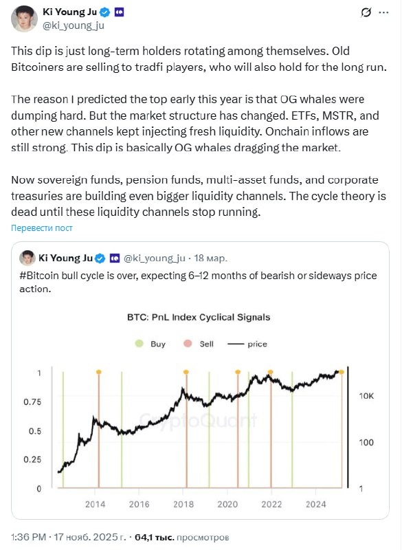Это падение — всего лишь ротация среди долгосрочных держателей. Старые биткоинеры продают игрокам из традиционных финансов, которые тоже будут держать BTC в долгую. Причина, по которой я предсказал вершину в начале года, заключается в том, что «старые киты» активно сливали. Но структура рынка изменилась. ETF, MicroStrategy и другие новые каналы продолжали закачивать свежую ликвидность. Потоки ончейн всё ещё сильные. Это падение — по сути, результат того, что OG-киты тянут рынок вниз. Теперь суверенные фонды, пенсионные фонды, мультиассетные фонды и корпоративные казначейства создают ещё более крупные каналы ликвидности. Теория циклов мертва, пока эти каналы ликвидности не перестанут работать.