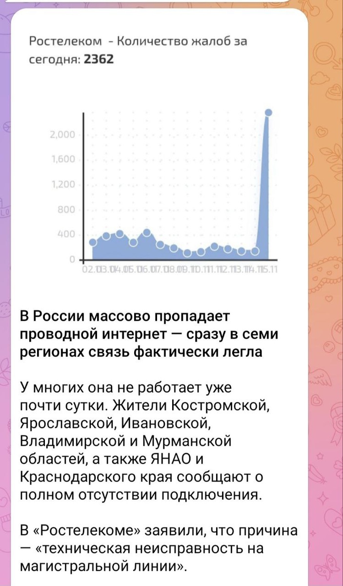 В новостях пишут, что произошло отключение уже проводного интернета в нескольких регионах