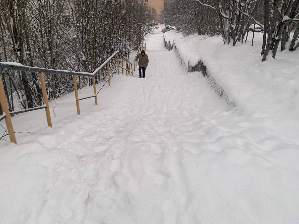 В ответ на пост #ОтЧитателей: Страдают не только фуры-длинномеры, но и пешеходы. Например, на улице Буркова нужны лыжи или ватрушки, чтобы перемещаться по лестницам и тротуару. #ГородскиеВторники на ❄ «Арктическом Обозревателе» (сегодня всё ещё понедельник!)