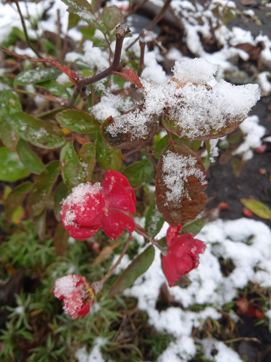 Вот и к нам пришла зима, точнее сказать первые зазимки и первый снег. Раньше в детстве в середине ноября у нас уже была настоящая зима, а сейчас климат изменился и первого снега на Покров 14 октября уже не дождешься. От первых зазимок обычно отсчитывали месяц по народным приметам до наступления настоящей зимы. Посмотрим, как в этом году сработают народные приметы. Первый снег у нас выпал в ночь с субботы на воскресенье. За окном сразу стало утром светло и чисто, но правда ненадолго. Сегодня опять потеплело и идет противный ноябрьский дождь. А завтра Гизметио обещает потепление до +12. С такой погодой никак не получается укрыть хурму, розы, виноград. В воскресенье на даче было красиво. Цветы под снегом – моя любимая трогательная ноябрьская картина.Розу Костеру накрыло первым снегом. С одной стороны очень красиво- яркие лепестки роз под чистым невинным снегом, а с другой стороны очень грустно- замершие льдинки на живом еще цветке,как символ уходящей красоты, тепла. Впереди нас ждет е
