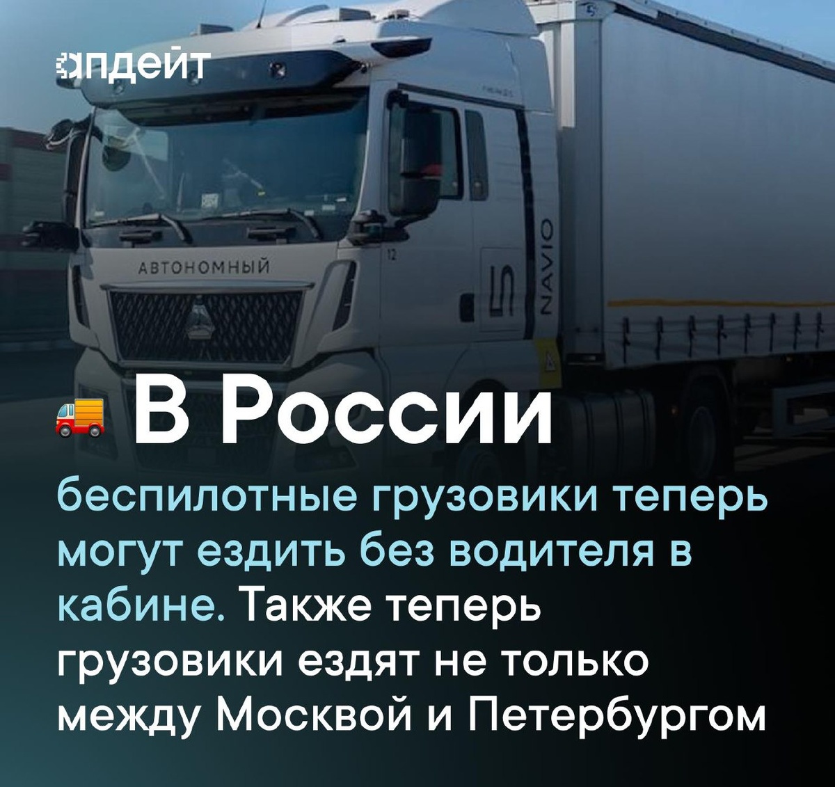 ⚡️Беспилотные грузовики теперь без наблюдателей Правительство РФ продлило эксперимент, разрешающий беспилотным грузовикам ездить по дорогам общего пользования, до 12 ноября 2028 года. Более того, теперь разрешена эксплуатация беспилотных грузовиков без водителя в кабине. Такие грузовики обязаны уметь безопасно останавливаться при сбоях ПО. Эксперимент расширяют на Башкирию, Пермский край и Свердловскую область — из-за запуска движения по трассе М-12 до Екатеринбурга. Ранее грузовики курсировали только между Москвой и Санкт-Петербургом. Высокоавтоматизированные грузовики появятся на дорогах в 2026 году и должны пройти суммарно 100 тыс. км. ⚡️ Подписаться.