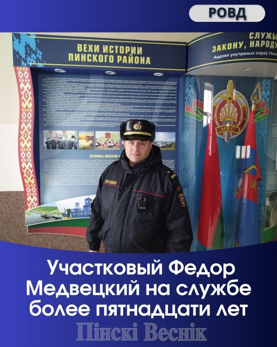 Сегодня служба участковых инспекторов милиции – это самое многочисленное подразделение с наибольшим объемом выполняемых задач и обязанностей. ПО моему мнению, должность «участковый инспектор милиции» – от слова «участие», так как сотрудник принимает ежедневное участие в жизни населения, в обеспечении правопорядка и законности на обслуживаемой им территории. ПОДРОБНОСТИ @Пинский Вестник ЮТУБ | САЙТ| ИНСТ | ВК | ОК | ФЕ | Прислать новость