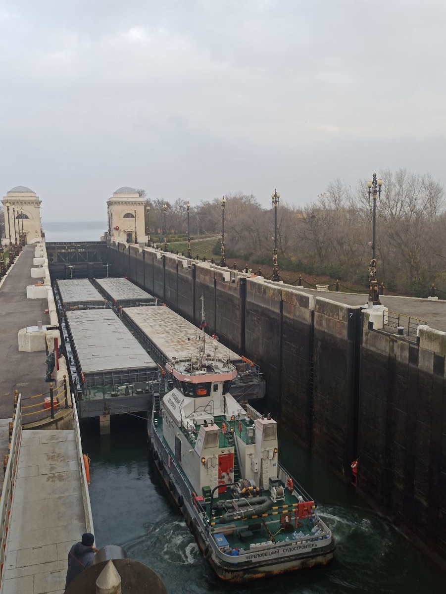 Четырехбаржевый пыжевой состав в камере шлюза Волго-Донского Судоходного канала имени Ленина🏛 За классное 📸 спасибо Евгению 👍 #РечнойФлотВолгоград #теплоход ##ВДСК #волгодонскойсудоходныйканал