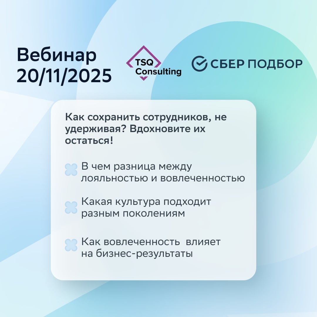 Ваш сотрудник уже обновил резюме? 🤫 А наши — нет. В чем секрет? Вся магия — в корпоративной культуре, где хочется работать, а не просто числиться. 20 ноября в 11:00 (мск) приглашаем на бесплатный вебинар от экспертов СберПодбора и TSQ Consulting. Мы сломаем стереотипы и дадим работающие инструменты: ❤️🔥 Чем вовлеченность отличается от лояльности? 🧩 Как угодить и бумерам, и зумерам? 📈 Как культура напрямую влияет на прибыль? Спикеры: • Татьяна Мощагина (СберПодбор) • Сергей Орлов-Горский (TSQ Consulting) Не управляйте текучкой — создавайте среду, из которой не уходят. Регистрируйтесь!