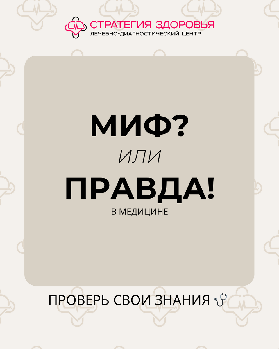 Медицинские мифы: правда или вымысел? 1. Чтобы остановить носовое кровотечение, нужно запрокинуть голову назад. - Миф. Запрокинув голову назад, вы лишь перенаправите кровь к горлу, что может вызвать рвотный позыв. Лучше зажмите нос, сядьте и наклонитесь вперёд. 2. При обморожении нужно растереть обмороженные места снегом. - Миф. Нужно дать возможность конечности согреться. Если же конечность потемнела или возникла боль, то нужно немедленно обратиться в больницу. 3. ️При вывихе, растяжении или ушибе нельзя прикладывать тепло к травме. - Правда. Растяжение, ушибы, вывихи — все эти травмы вызывают отек тканей. При этом нельзя прикладывать грелку к больному месту. Это может усилить отек и болевые ощущения. Необходимо ограничить движение ушибленного участка, приложить лед и постараться быстрее добраться к травматологу для осмотра. 4. Анализы можно расшифровать самостоятельно по таблицам в интернете. - Миф. Реальность: рискованное занятие! В интернете можно найти общую информацию, но ин