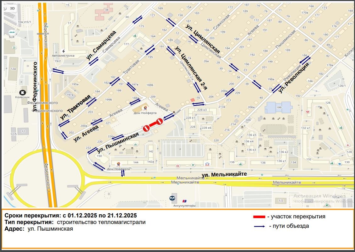 20 дней ограничений На период производства работ по строительству тепломагистрали с 1 по 21 декабря планируется прекращение движения транспорта по ул. Пышминской, в районе дома № 226а. Участников дорожного движения просим обращать внимание на дорожные знаки, заранее планировать маршрут движения, соблюдать Правила дорожного движения РФ. Возможные маршруты объезда: ул. Агеева, ул. Цимлянская, ул. Трактовая, ул. Самарцева.