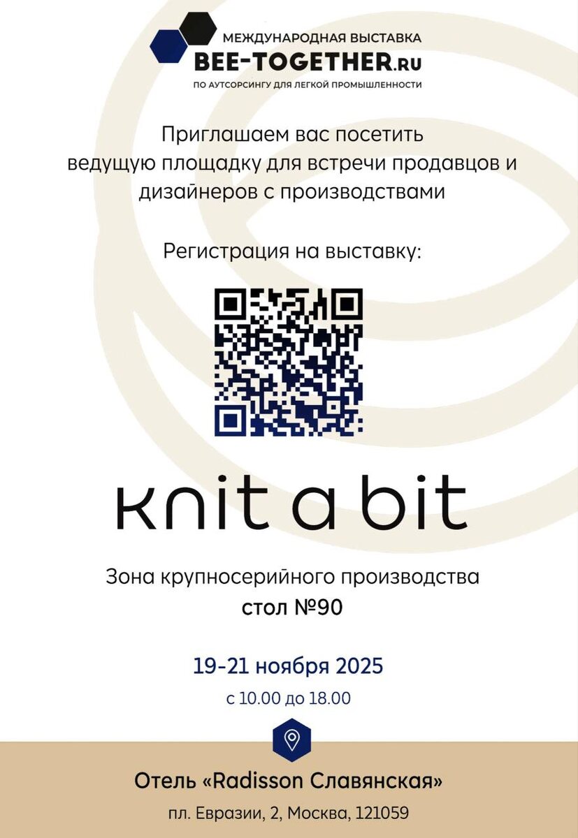 Дорогие друзья и коллеги! Фабрика Knit a bit примет участие в международной выставке BEE-TOGETHER, которая пройдет уже на этой неделе — с 19 по 21 ноября на территории отеля Radisson Славянская.✨ Чтобы стать участником, необходимо зарегистрироваться на сайте bee-together.ru или на стойке регистрации непосредственно в отеле. Площадка Bee-together предоставляет уникальную возможность для брендов —найти подрядчиков, а для фабрик — найти заказчиков. А также провести переговоры и заключить контракты прямо в день встречи.🤝 Мы расположимся в зоне крупносерийного производства, стол #90. Будем рады пообщаться!🤗