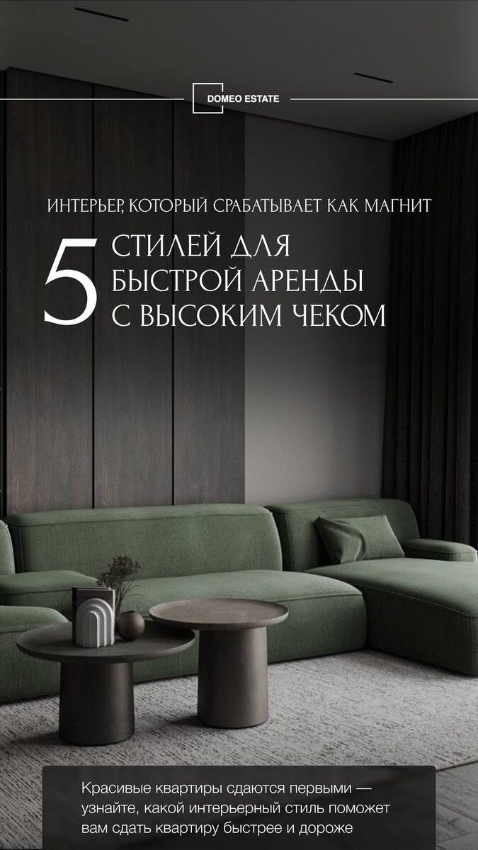 Знаете, что первым делом привлекает арендаторов? Внешний вид квартиры. Даже если жильё временное — людям всё равно хочется заходить в квартиру, интерьер которой вызывает ощущение уюта и стиля. 💯 При обустройстве квартиры один из самых важных этапов — выбор дизайна интерьера. Ведь от него зависит не просто атмосфера, а скорость, с которой квартира найдёт своих жильцов, и уровень арендной платы. 📌Сегодня существует более 100 интерьерных стилей. Мы выбрали пять самых популярных, которые дизайнеры Domeo ESTATE используют чаще всего — те, что точно придутся по вкусу арендаторам и помогут повысить доходность объекта. 1. Минимализм Выбор для тех, кто хочет стабильный спрос. Этот стиль остаётся лидером на рынке аренды: нейтральная палитра и атмосфера как на страницах Pinterest привлекают широкую аудиторию, особенно молодёжь. Цвета: белый, серый, графит, природные акценты. Отделка: ровные стены, матовые поверхности, минимум визуального шума. Мебель: встроенные системы хранения, функциона
