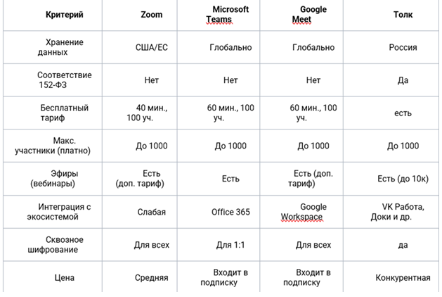 Сравнительная таблица «Толк» vs. Zoom и другие, которая даёт соотношение плюсов и минусов для пользователя: