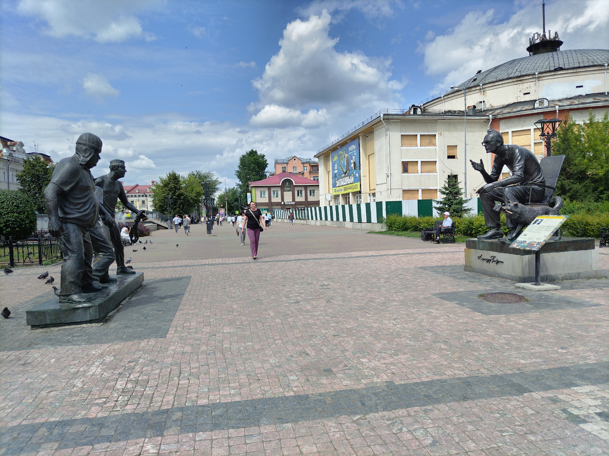 На Иркутск я оставила побольше дней, по этому на следующий день ищу в интернете что посмотреть, нахожу дом купца Второва. Роскошный особняк был построен в 1897г. Я дату специально посмотрела, выстроить такой особняк, а вот пожить в нём Второву пришлось немного. По дороге встретила вот такой памятник, Гайдай снимает фильм "Приключение Шурика". Особняк служит детям, с 1936г -Дом пионеров, сейчас Дом Творчества, Смотрится необычно, ярко и впечатляет. Внутри по фото тоже красиво, но я не заходила. Ищу следующий особняк купца Исая Файнберга. Меня очень смущали эти звёзды, я решила, что это Советы их добавили в декор и не обратила внимание, что звезды 6-конечные, а советская звезда 5-конечная. Вот только что и разглядела, что это звёзды Маген Давид. Сам купец с семьей в этом доме не жил, он его сдавал. В 1990г под домом было найдено подземелье, где обнаружили около 20 скелетов с простреленными черепами. В 1918-20годах здание занимало охранка Колчака. Потом была научная библиотека, а сейч