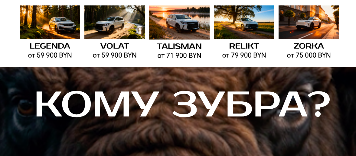 Скоро в Беларуси появится новый бренд автомобиля – ZUBR. Это событие можно смело назвать историческим: ZUBR не только подчеркивает потенциал национального автопроизводства, но и становится реальной альтернативой зарубежным маркам, сообщает Myfin.by. Но главная интрига новой белорусской марки автомобиля ZUBR – это условия покупки. На новый автомобиль действует рекордно низкая кредитная ставка – всего от 1,9% сроком до 10 лет! На сегодняшний день таких условий не предлагает ни один производитель и продавец на рынке Беларуси. На официальном сайте автомобиля zubr-auto.by заявлено 5 моделей марки: LEGENDA, VOLAT, TALISMAN, RELIKT, ZORKA. Цены на машины начинаются от 59 900 BYN в минимальной комплектации до 84 900 BYN в максимальной. Почему ZUBR уже называют «народным» автомобилем? Представители бренда утверждают: «Мы хотим, чтобы каждая белорусская семья могла позволить себе современный новый автомобиль, не переплачивая». Вся остальная информация хранится в секрете. Официальное открытие