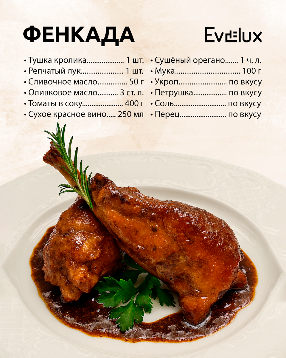Фенкада — нежнейшее блюдо из кролика в вине, томатах и пряных травах. Чтобы сохранить его сочность и раскрыть все оттенки вкуса, важно равномерно его пропекать — с этой задачей отлично справляется духовой шкаф Evelux EO 640 PB, поддерживая стабильную температуру на протяжении всего приготовления. Узнать о возможностях модели вы можете по ссылке: https://clck.ru/3QMhBJ
