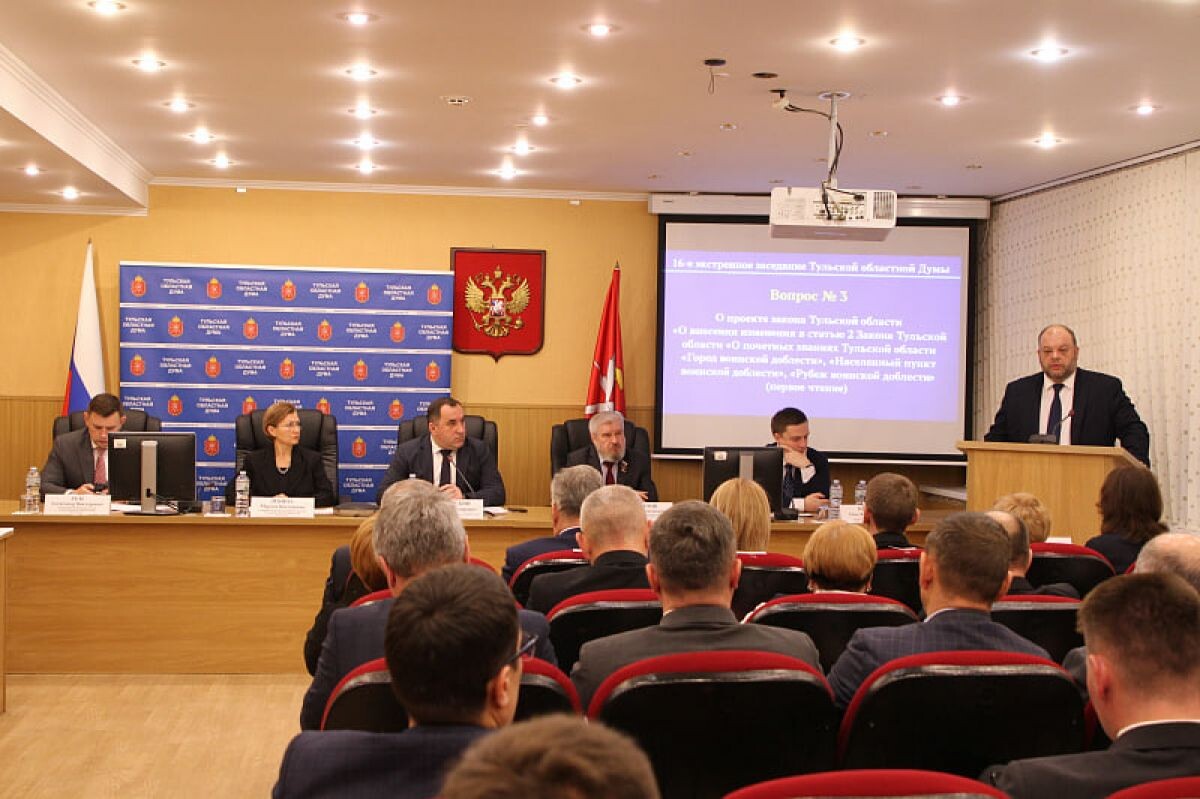 На 16-м внеочередном заседании Тульской областной Думы депутаты обсудили изменения в статью 2 закона, касающегося почетных званий "Город воинской доблести", "Населенный пункт воинской доблести" и "Рубеж воинской доблести". Цель поправок – дальнейшее увековечивание подвига героев Великой Отечественной войны. Речь идет о возможности присвоения званий населенным пунктам, возникшим на месте территорий, где в годы войны шли ожесточенные сражения. – В год юбилея Великой Победы мы проводим системную работу по сохранению исторической памяти. Данные изменения позволят отдать дань уважения подвигу защитников Отечества даже в тех случаях, когда на карте области сегодня находятся уже другие административные единицы. Это важный шаг в укреплении связи времен и патриотическом воспитании молодежи, – подчеркнул председатель Тульской областной Думы Андрей Дубровский.