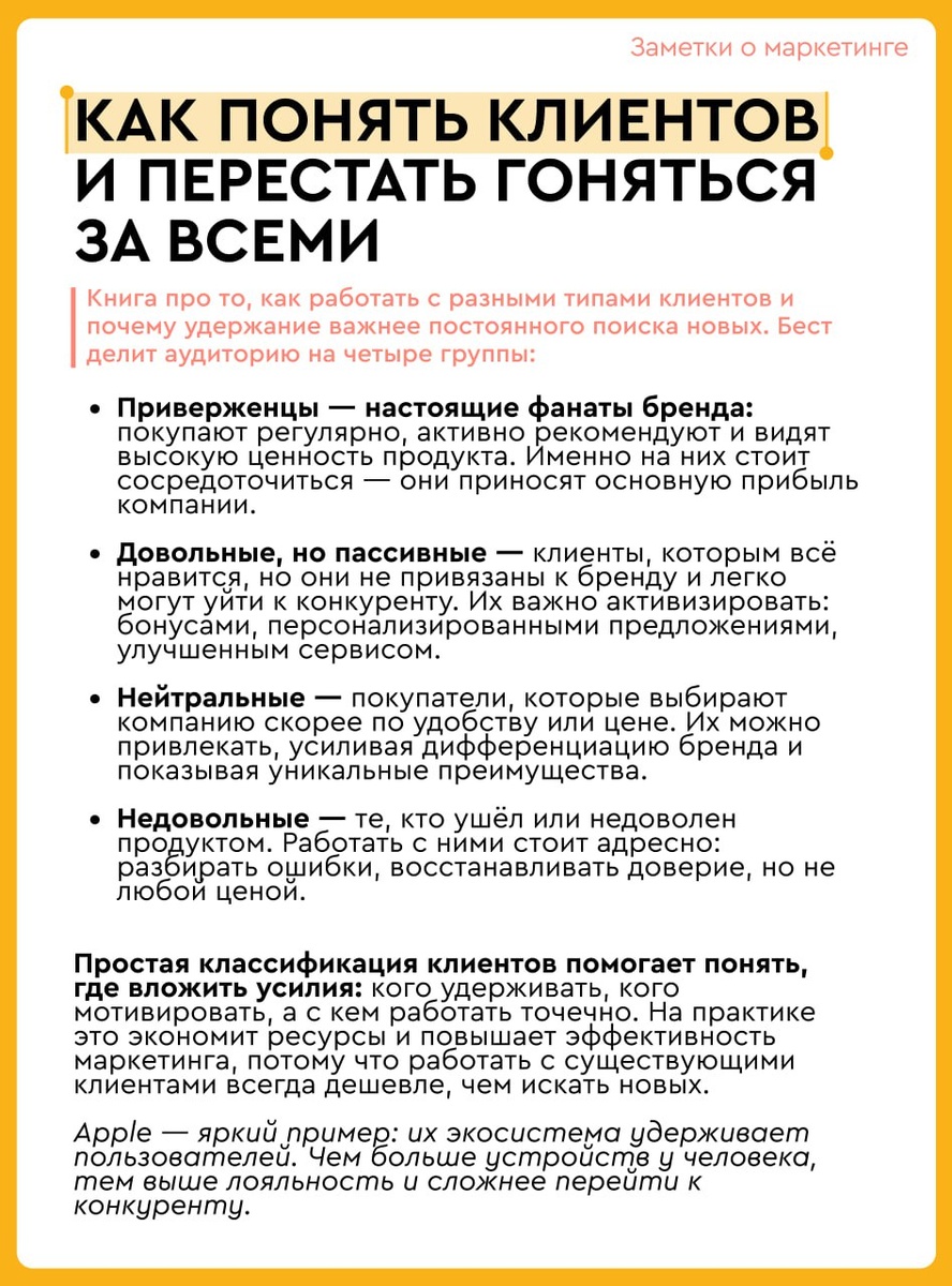 ⚡️Маркетинг от потребителя: как понять клиентов и перестать гоняться за всеми Когда я читаю книги про маркетинг, мне важно, чтобы они не просто давали схемы и термины, а помогали смотреть на людей — тех, для кого мы создаем продукты. Сегодня разбор — Роджер Бест «Маркетинг от потребителя». Книга про то, что удержание клиентов гораздо важнее, чем бесконечный поиск новых, и как работать с разными типами аудитории. Бест делит клиентов на четыре группы: 🔝Приверженцы 🔝Довольные, но пассивные 🔝Нейтральные 🔝Недовольные Для меня ключевой момент книги — понимание, что клиенты — это не просто цифры в отчётах. Если видишь, где они находятся на «шкале лояльности», проще принимать решения: кого удерживать, кого активизировать, где создавать дополнительную ценность. Для меня лично это важно, потому что часто вижу маркетинг, который выглядит красиво на бумаге или в презентации, но не учитывает реальное поведение людей. Книга Беста напоминает: маркетинг работает, когда понимаешь людей и то, п