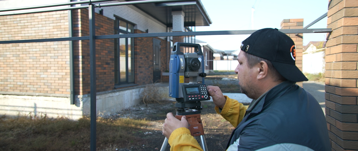Инженер проводит обмеры дома и привязывает его к участку с помощью специальных приборов.
