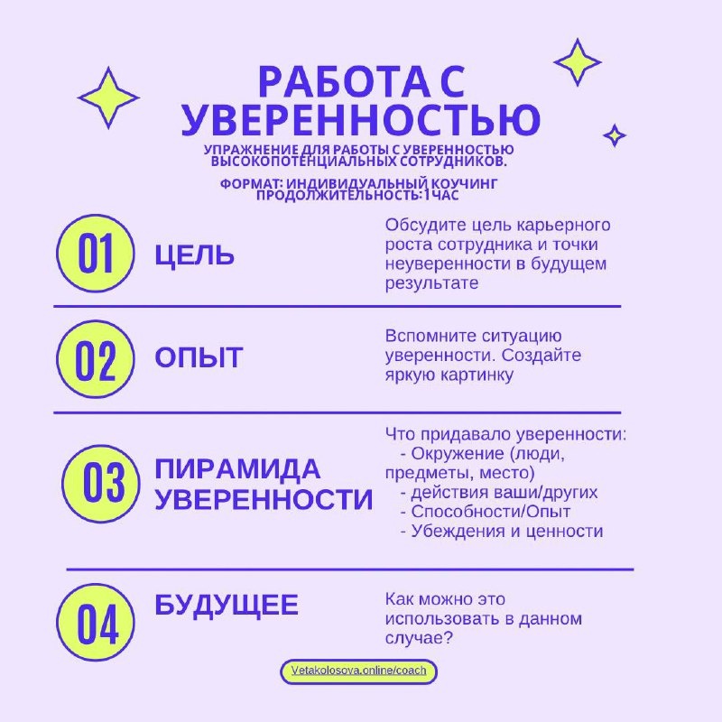 Продуктивный понедельник: Пробуем новую рубрику) -Упражнение для работы с уверенностью сотрудника -подходит для работы в индивидуальном формате с высокопотенциальными сотрудниками -в бизнес-Коучинге для становления новичков (например, когда продажи или переговоры ставите сотрудникам) -в постановке навыка работы с проектами и кроссфункциональном взаимодействии Где еще может применяться данная техника? Напишите в комментариях) #коучсветланаколосова
