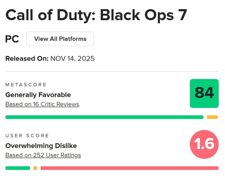 - На Metacritic у так называемой игры (анти)рекордные 1.6 баллов от игроков – предыдущий рекорд принадлежал легендарно плохой Modern Warfare 3 с оценкой 2.3.