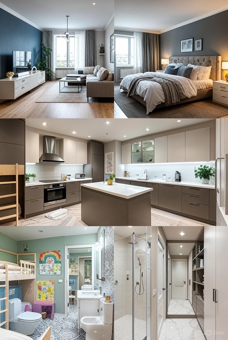 • Зонирование без стен: используйте разные напольные покрытия (паркет + керамогранит), подиумы, ковры размером 3×4 м и световые сценарии.