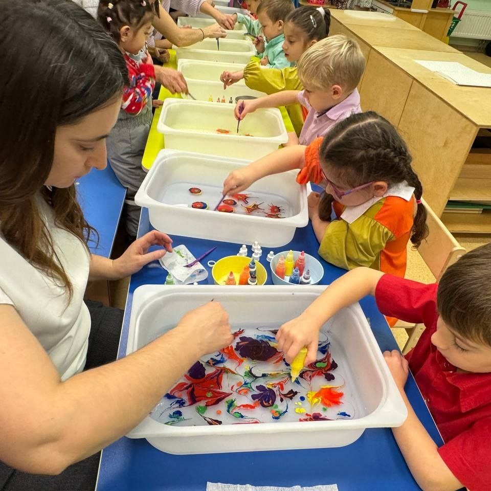 Танцуют краски - оживают сказки! 🎨 В детском саду «Воскресеночка» прошел необычный мастер-класс для детей и родителей. 💦 Дошколята вместе с мамами и папами создавали произведения в древней технике «эбру» — рисование на воде. 🦋 Родители и ребята создавали удивительные узоры: загадочные цветы, космические галактики и причудливых бабочек. Самый волшебный момент — это перенос рисунка с поверхности воды на бумагу. 🤓 Такие занятия — это бесценный опыт для дошкольников, ведь в процессе развивается креативное мышление и мелкая моторика, ребята учатся работать вместе и понимать друг друга без слов и, конечно, получают незабываемые эмоции и общие воспоминания! #школа338 #ДОНМ #17ноября #ТиНАО #дошколка