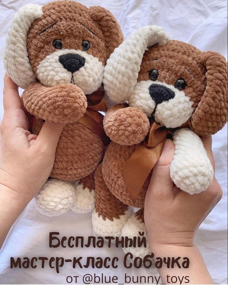 Материалы Ушки 1р. 8сбн в КА 2р. 8пр - 16 3р. (сбн, пр)*8 - 24 4р. (2сбн, пр)*8 - 32 5-7р. 32сбн 8р. (6сбн, уб)*4 - 28 9р. 28сбн 10р. (5сбн, уб)*4 - 24 11р. 24сбн 12р. (4сбн, уб)*4 - 20 13р. 20сбн 14р. (3сбн, уб)*4 - 16 15р. 16сбн 16р. (2сбн, уб)*4 - 12 17р. 12сбн Сложить пополам, провязать 6сбн за две петли вместе. Закрепить и отрезать нить. Нос Оставить в начале длинный конец нити для того, чтобы вышить полосочку под носиком Вяжем поворотными рядами 1р. 2вп, во 2-ю петлю: пр 2р. вп, 2пр - 4 3р. вп, (сбн, пр)*2 - 6 4р. вп, (2сбн, пр)*2 - 8 5-6р. 8сбн Далее делаем вп и обвязываем по кругу 5сбн по первой стороне, сбн в основание и 5сбн по второй стороне. Ниточку закрепить и отрезать, оставляем длинный конец для пришивания. Хвостик 1р. 6сбн в КА 2р. (2сбн, пр)*2 - 8 3р. (3сбн, пр)*2 - 10 4-5р. 10сбн Сложить пополам, провязать 5сбн за две петли вместе. Закрепить и отрезать нить. Голова Начинаем вязать нитью белого цвета 1р. 7вп во 2-ю от крючка: 5сбн, 3сбн в одну, 4сбн, пр - 14 2р. пр, 4