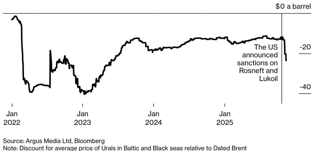 Российскую нефть продают за 36 долларов в портах выгрузки Чёрного и Балтийского морей Это самая низкая цена с начала СВО. Возможно и дальнейшее снижение цены из-за суперсанкций Трампа. Теперь ждём ответ от российских элит, которые скорее всего усилят экономический и налоговый гнёт против населения России.