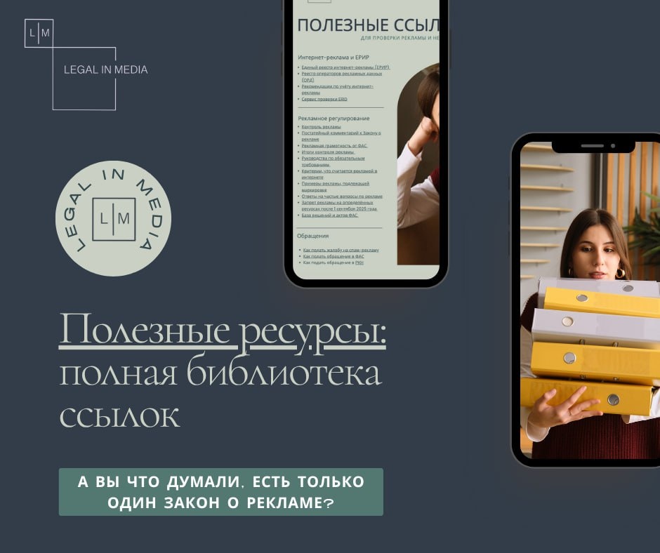 🎯 А вы что думали, есть только один закон о рекламе? Вот он, родной: 👉 ФЗ «О рекламе» Но нет 😎 Есть ещё куча полезных разъяснений, писем и документов, которые помогают проверить рекламу (и не только!) на соответствие закону ⚖️ 📚 Мы собрали всё самое нужное — в одном месте: разъяснения, ссылки, шпаргалки, чтобы вы не тратили часы на поиски. 📖 Забрать подборку можно у нашего бота — только для подписчиков канала. Переходите по ссылке и скачивайте свои полезняшки 🎁: @legalCheck_bot 🧐 А если не хотите разбираться и читать все эти нормативки, мы с радостью проверим вашу рекламу сами! Пишите ➡ @Legal_in_Media или просто нажмите кнопку «Чат» в левом нижнем углу 💬 P.S. Подборку подготовила Алина — наш человек, который знает, где искать нужные документы, даже если их ещё не успели опубликовать 😏 Накидайте ей огоньков 🔥🔥🔥