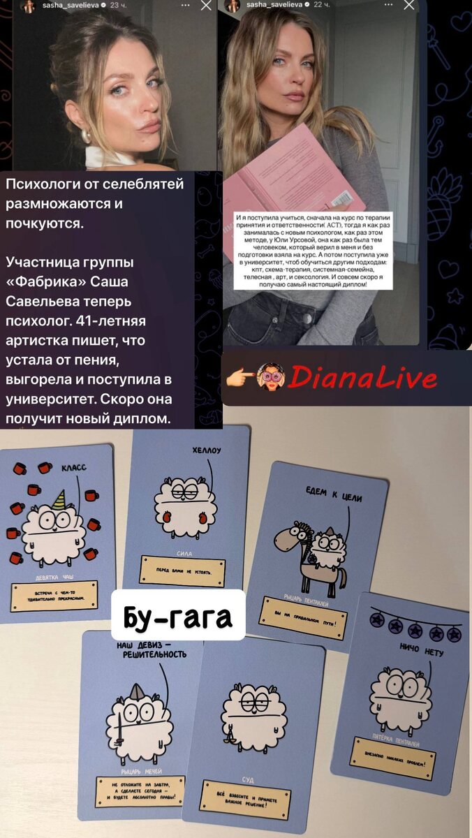 🐱Зашла к Ди https://t.me/dianalivelive/54597 и аж настроение поднялось: когда-то селеба Саша Савельева, не Бог весть какая певица устала от того, чего собственно, никогда и не умела. ПЕТЬ. Ну и естественно 🐱пошла учится на факультет Бородиной) на психолога. Зачем, а главное, для чего нам это всё ей психология? Из всей троицы Фабрики, у Ирины Тоневой — классный голос, у Сати Казановой — яркая внешность, а у Савельевой… в будущем муж хороший затрудняюсь с ответом. Сашке 42 скоро, самый сок для кризиса (Суд, рыцарь мечей), ищет себя человечек. 🐱Я вот патологически путаю ее с Ковальчук из Блестящих, но у той хотя бы муж Чумаков нет-нет, да отмочит что-нибудь эдакое, ниже пояса, «прославляет» пару. У Саши все спокойно, чинно, благородно и… скучно (9 чаш). А после «былой славы», прям печаль-тоска. Какой псих-олог из нее выйдет? Пока трудно сказать, — дорога длинная и путь тернист (рыцарь пентаклей). А как вам Бородина, как психолог? Ну вот примерно также НИ О ЧЕМ (5 пентаклей). Ну зато
