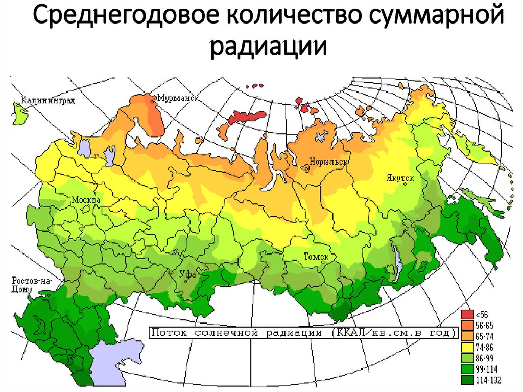 До земной поверхности доходит лишь одна двухмиллиардная часть энергии Солнца. Основная часть рассеивается в мировом пространстве. Солнечное тепло, дошедшее до земной поверхности при ясной и безоблачной погоде, называется прямой радиацией. Та часть, которая рассеивается в атмосфере, называется рассеянной радиацией. Она тоже попадает на поверхность Земли. В районах, где часто наблюдается погода с высокой облачностью, например Дальний Восток, величина рассеянной радиации больше прямой. С рассеянной радиацией связан голубой цвет неба. Вся солнечная радиация (прямая плюс рассеянная) называется суммарной солнечной радиацией. На специальной карте изолиниями показывают величину суммарной солнечной радиации. На ней хорошо прослеживается общая зональная закономерность — суммарная солнечная радиация нарастает при движении с севера на юг. Например, на полуострове Ямал (70° с. ш.) в течение года на 1 см² поверхности приходится 70 ккал тепла, а на Прикаспийской низменности и в Калмыкии — более 120 ккал. Многие южные районы нашей страны получают солнечное тепло преимущественно в виде прямой солнечной радиации.